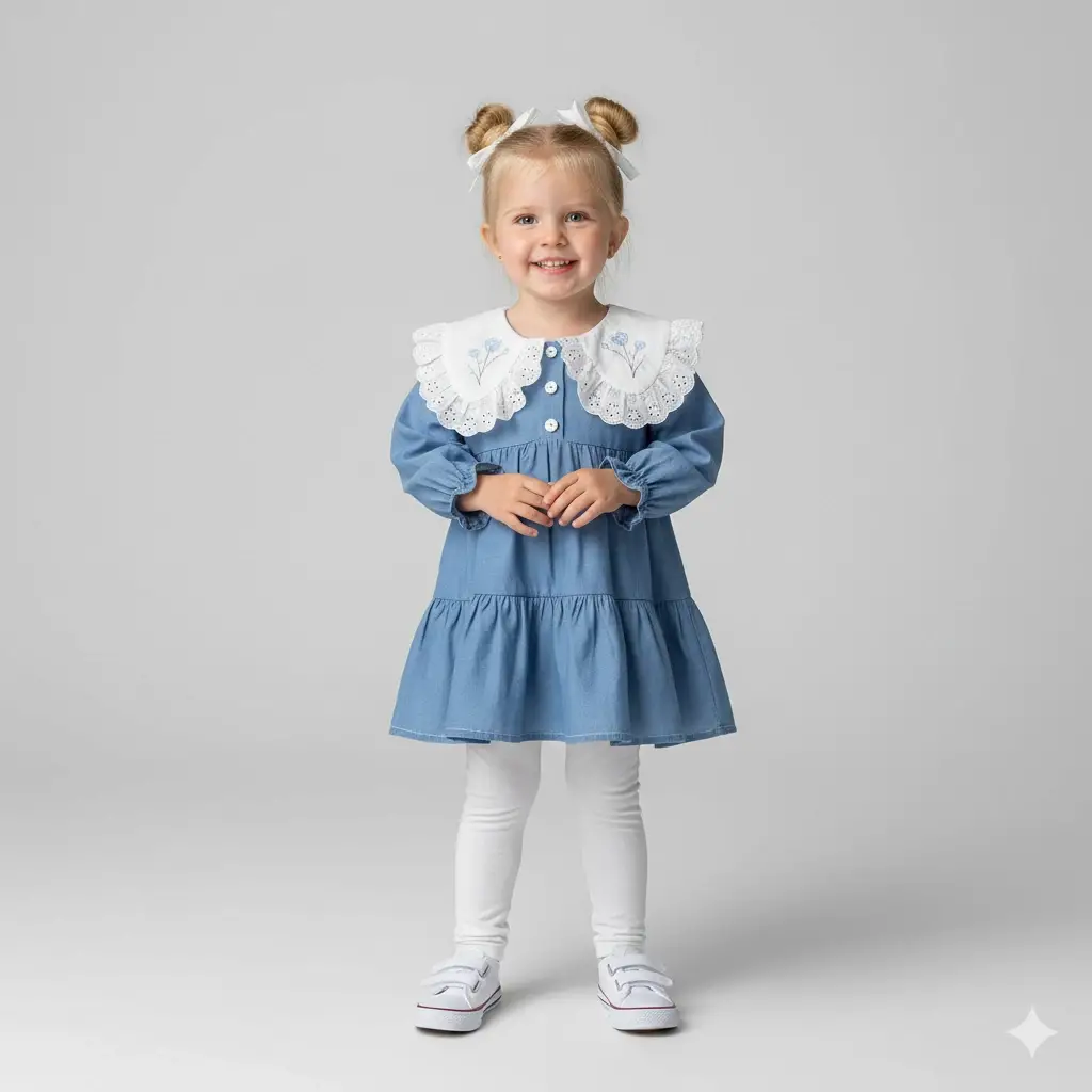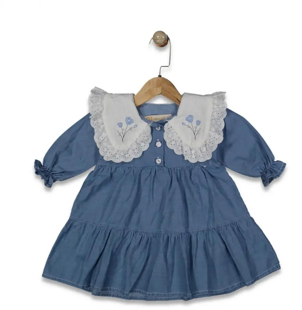 1-5 Yaş Yaka Çiçek Nakışlı Katlı Kot Elbise