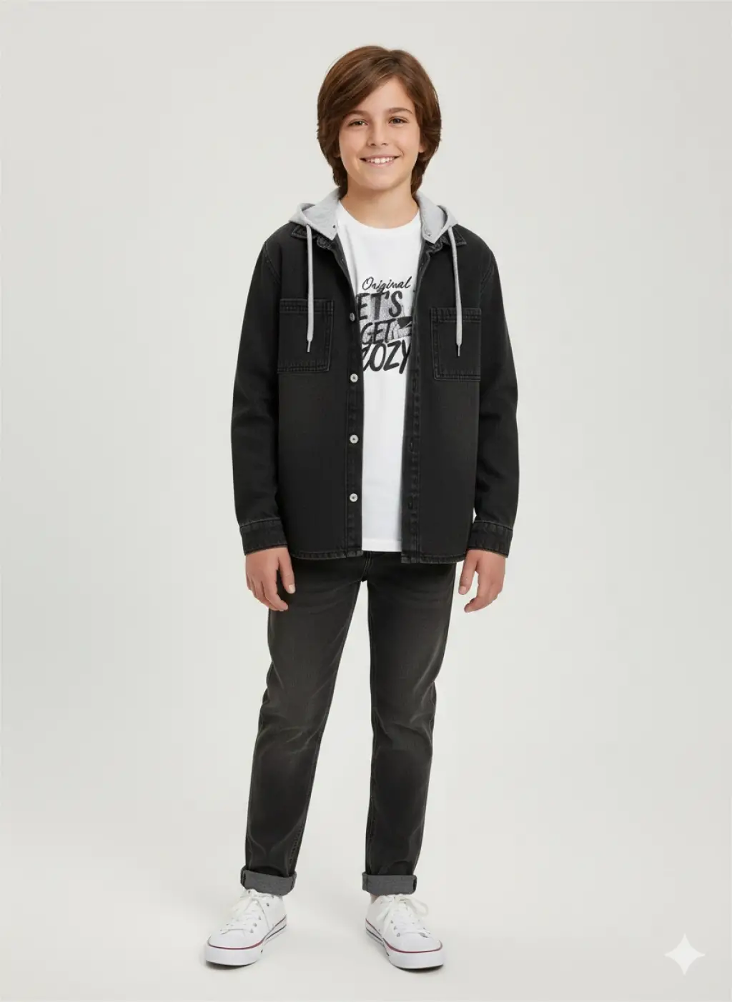 10-13 Yaş Kapşonlu Siyah Kot Ceketli 3lü Takım
