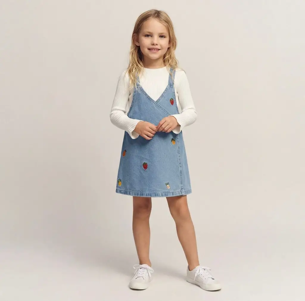 2-7 Yaş Meyve Baskılı Kot Salopet Elbise