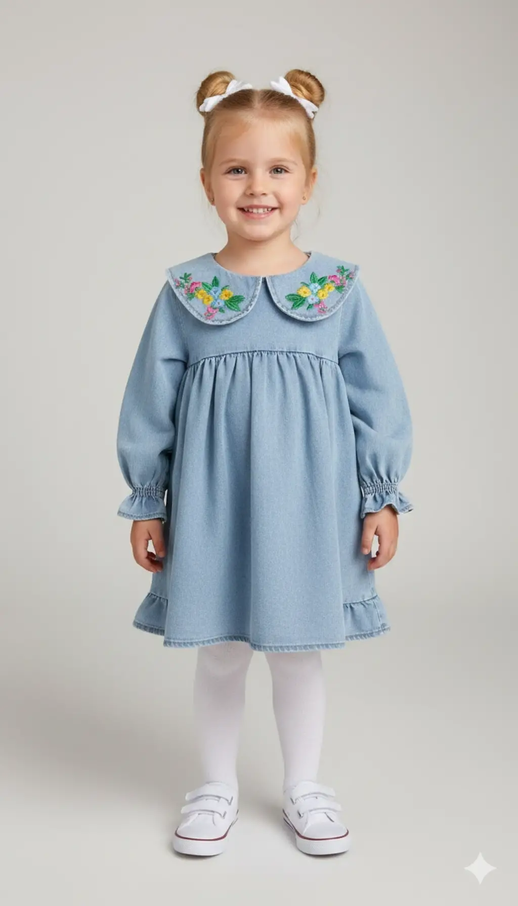 2-7 Yaş Yaka Çiçek Nakışlı Kot Elbise