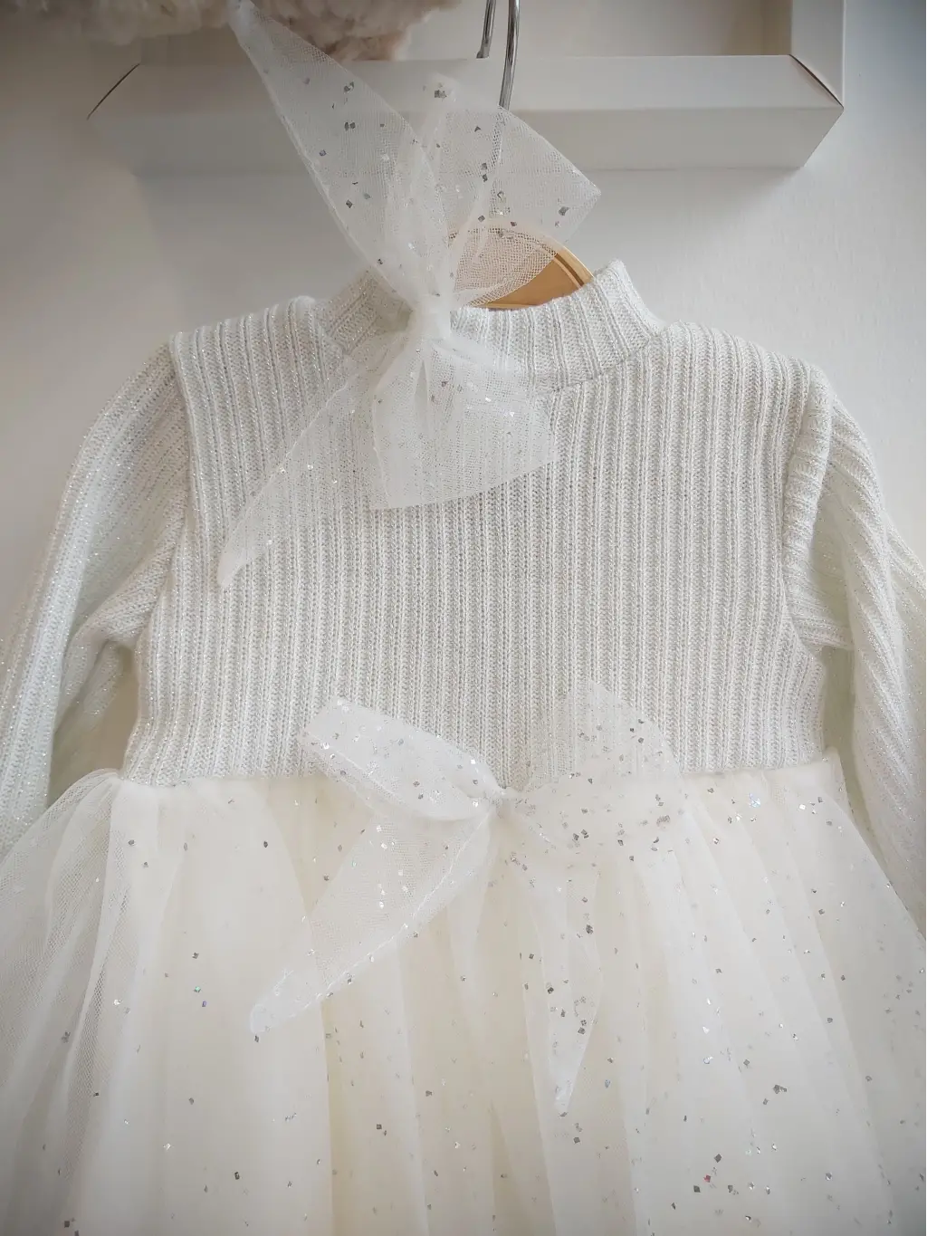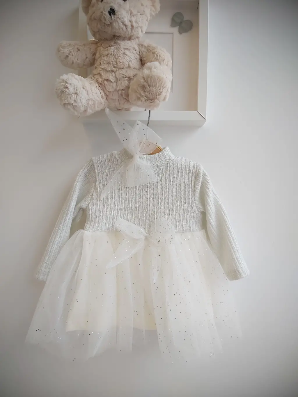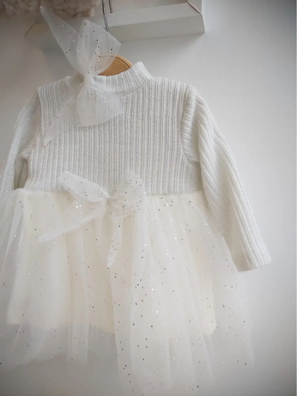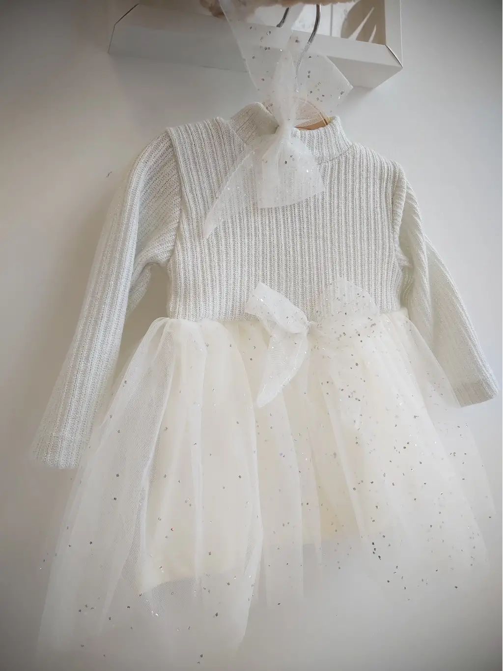 6-24 Ay Ekru Simli Tütülü Tokalı Triko Elbise
