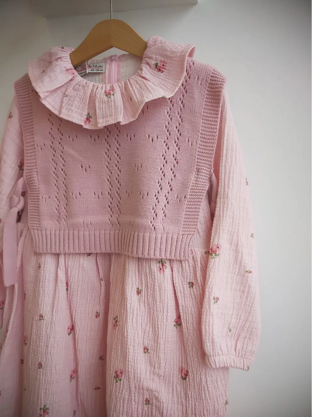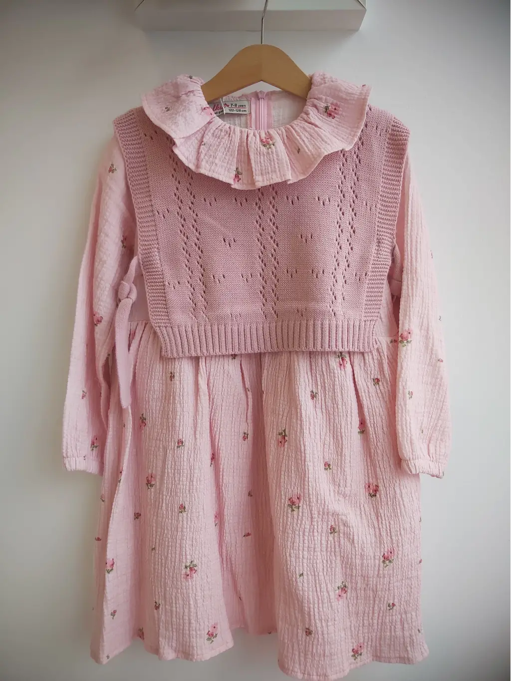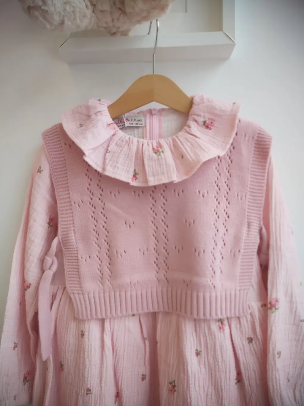 7-10 Yaş Pembe Fırfırlı Triko Süveterli Elbise