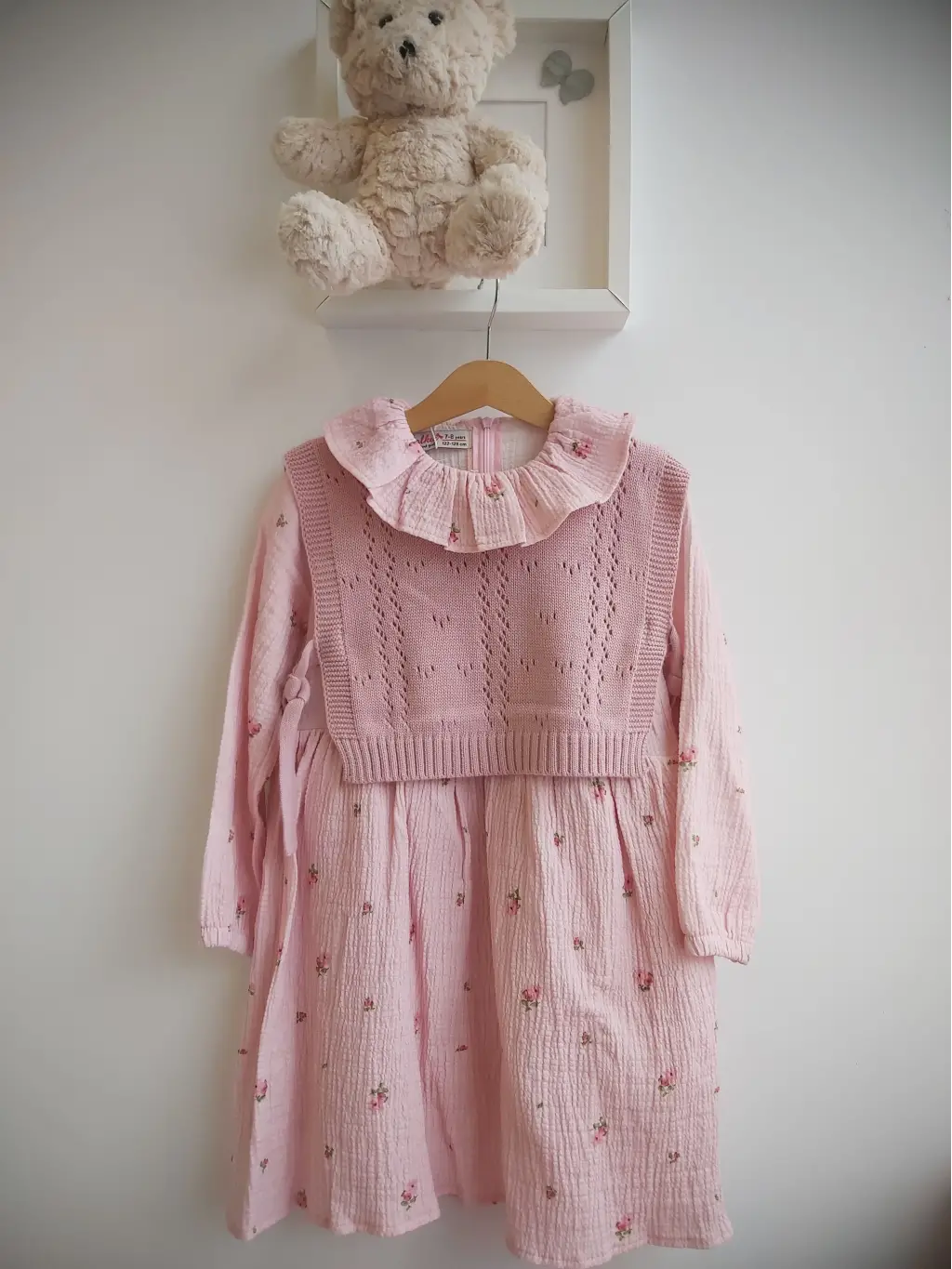 • 7-10 Yaş Pembe Fırfırlı Triko Süveterli Elbise