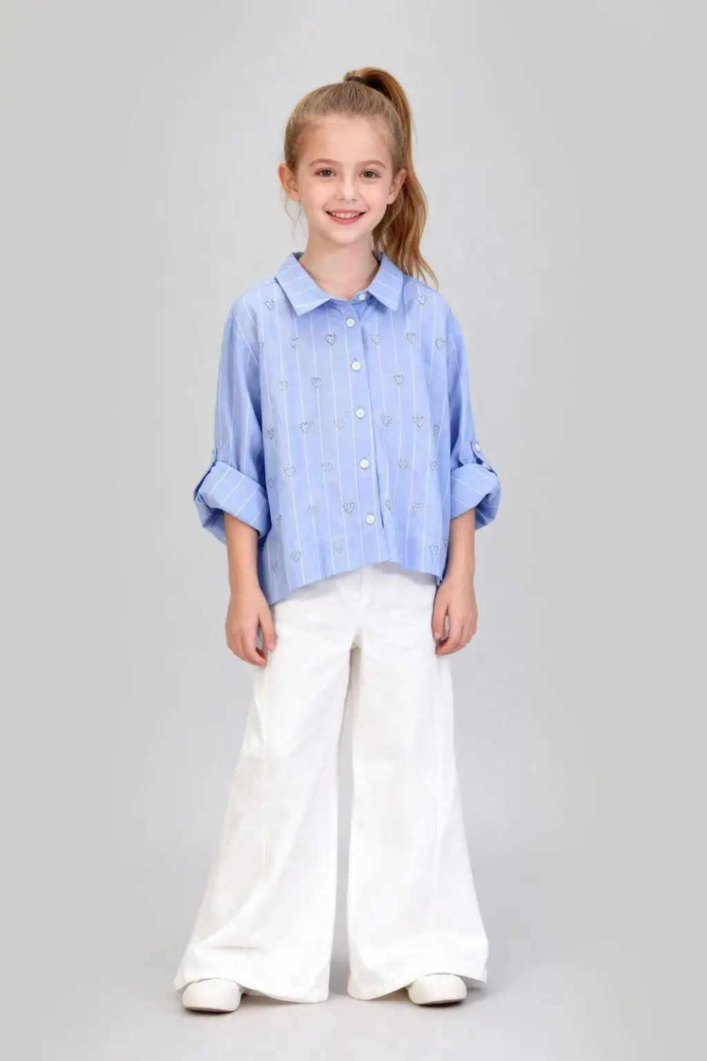 8-11 Yaş Mavi Çizgili Kalp İşlemeli Takım