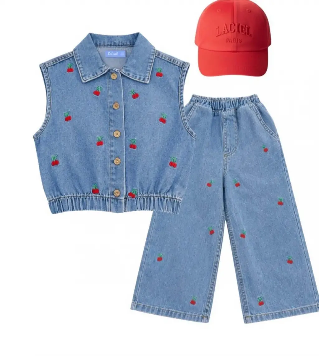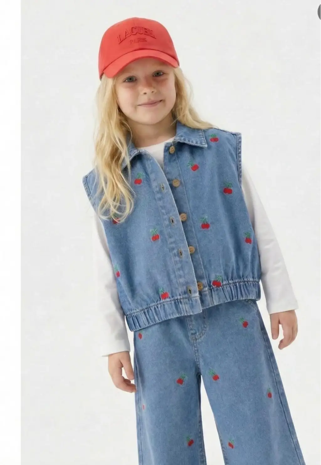 2-7 Yaş Kirazlı Kot Yelekli Takım